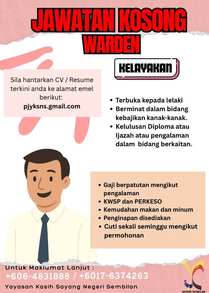 Yayasan Kasih Sayang Negeri Sembilan kini membuka jawatan Warden kepada calon yang berkelayakan dan berminat dalam bidang kebajikan kanak-kanak.